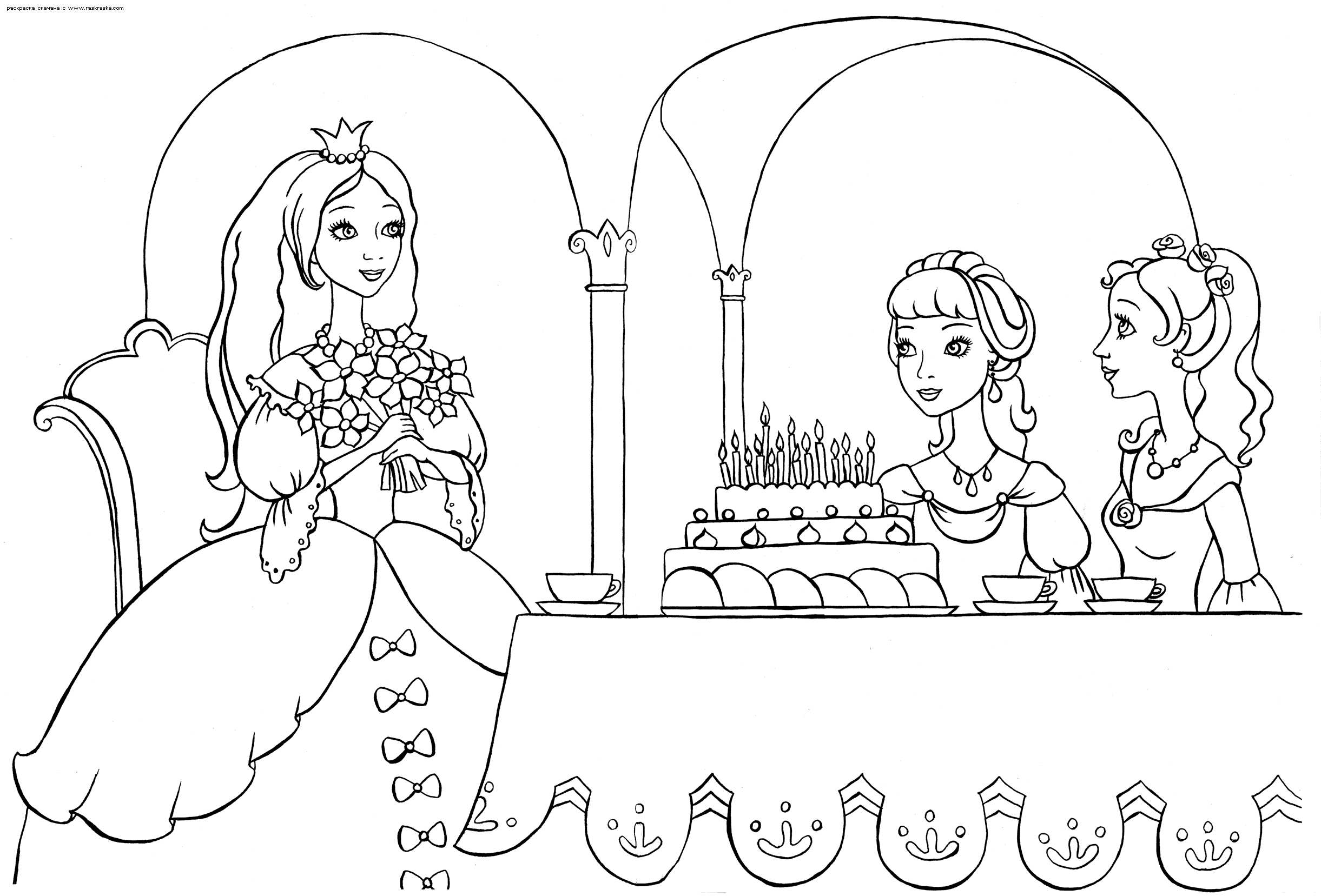 Принцеси п'ють чай з тортиком, розфарбування. Раскраска Принцеси, чаювання, розфарбування, торт, десерт завантажити бесплатно онлайн