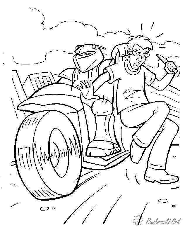 черепашка ніндзя ловить злодюжку. Раскраска черепашки ніндзя, розмальовки, розмальовки хлопчикам, teenage mutant ninja turtles, мотоцикл, злодюжка завантажити бесплатно онлайн